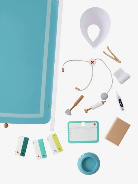- Contient : 1 chariot, 1 collerette, 1 stéthoscope, 1 seringue à pousser, 1 pince, 1 bandage, des croquettes, 1 gamelle, 1 thermomètre, otoscope, planning de RDV, 3 boîtes de médicaments
