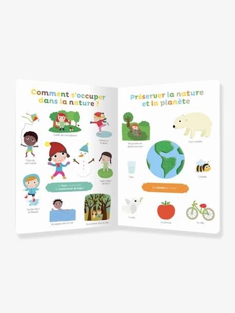 Tout au long de cet ouvrage, l’enfant découvre tout en douceur la faune et la flore, classées par thèmes les arbres, les fleurs…, au travers d’illustrations les représentant. Il commencera également à aborder les questions environnementales telles que : Comment s’occuper de la nature ? Comment préserver la nature et la planète ? A chaque page, l’enfant pourra toucher une nouvelle matière et visualiser une dizaine d’images : une excellente façon d’apprendre aux tout-petits à prononcer de nouveaux mots et de participer à l’éveil de leur sens tactile.